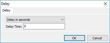 Delays may be set in seconds (up to 99999 seconds allowed) or in milliseconds (thousandths of a second). Just click on the option preferred and enter the number of seconds or milliseconds in the Delay Time edit box. Seconds may be inserted as fractions of a second by using a decimal point such as .5 to signify a half second delay. Or 350 milliseconds equates to a little over 1/3 of a second delay.
